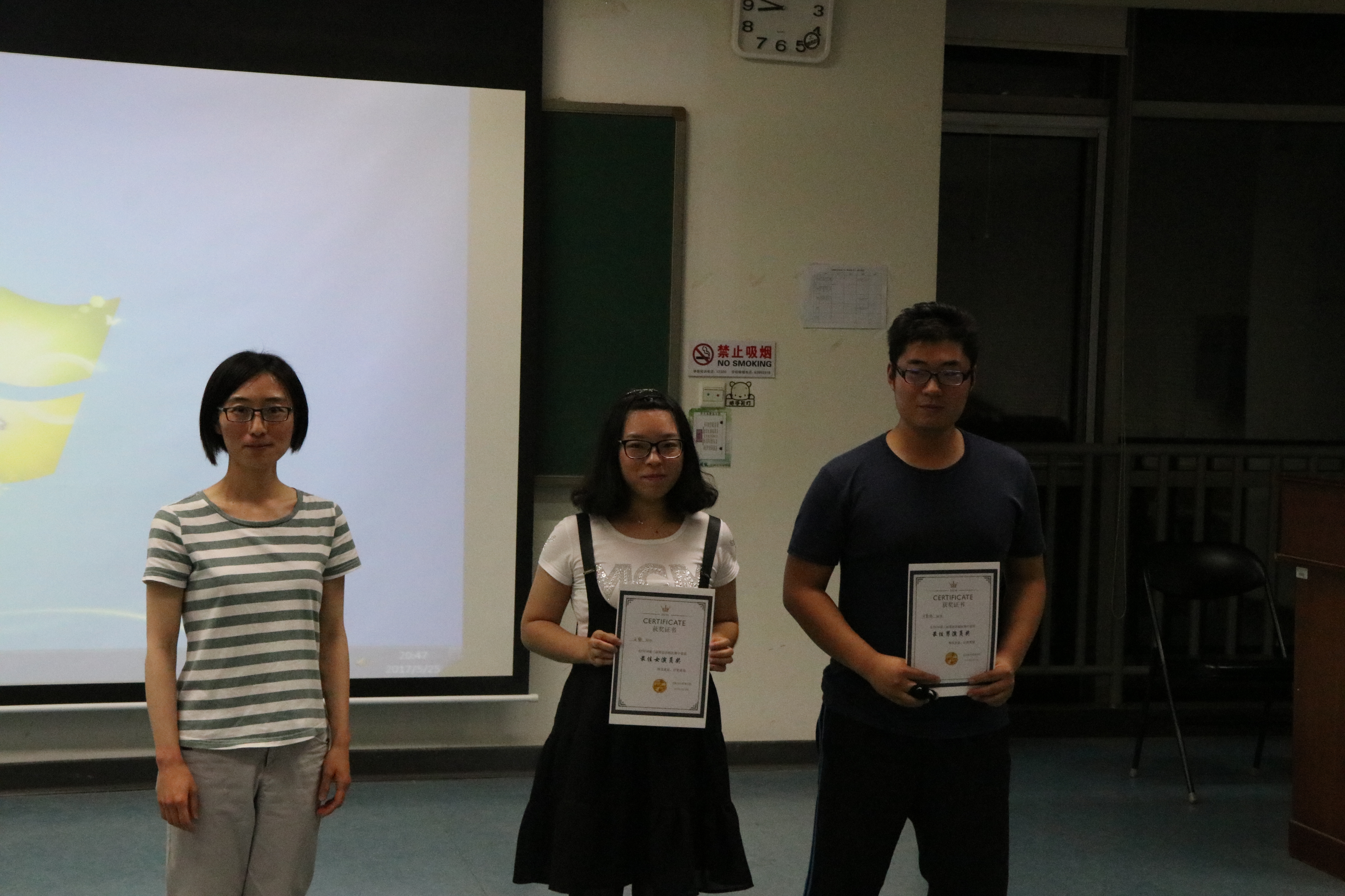 在博学楼第六阶梯教室举办了“Mini Stage Play”第三届英语话剧比赛。出席本次比赛的嘉宾有:副院长高静老师、直属团支部书记雷露老师、学生辅导员徐敬尧老师、2016级班主任杨欣彤老师、苏立老师。计量教研组陈烨老师、微观教研组刘知微老师、应用教研组尚英老师、金融教研组张婷婷老师、宏观教研组张蕊老师共同担任本次话剧比赛的评委。比赛由应用教研组李晓凤老师和2016级金融经济班学生吕硕鑫担任主持。