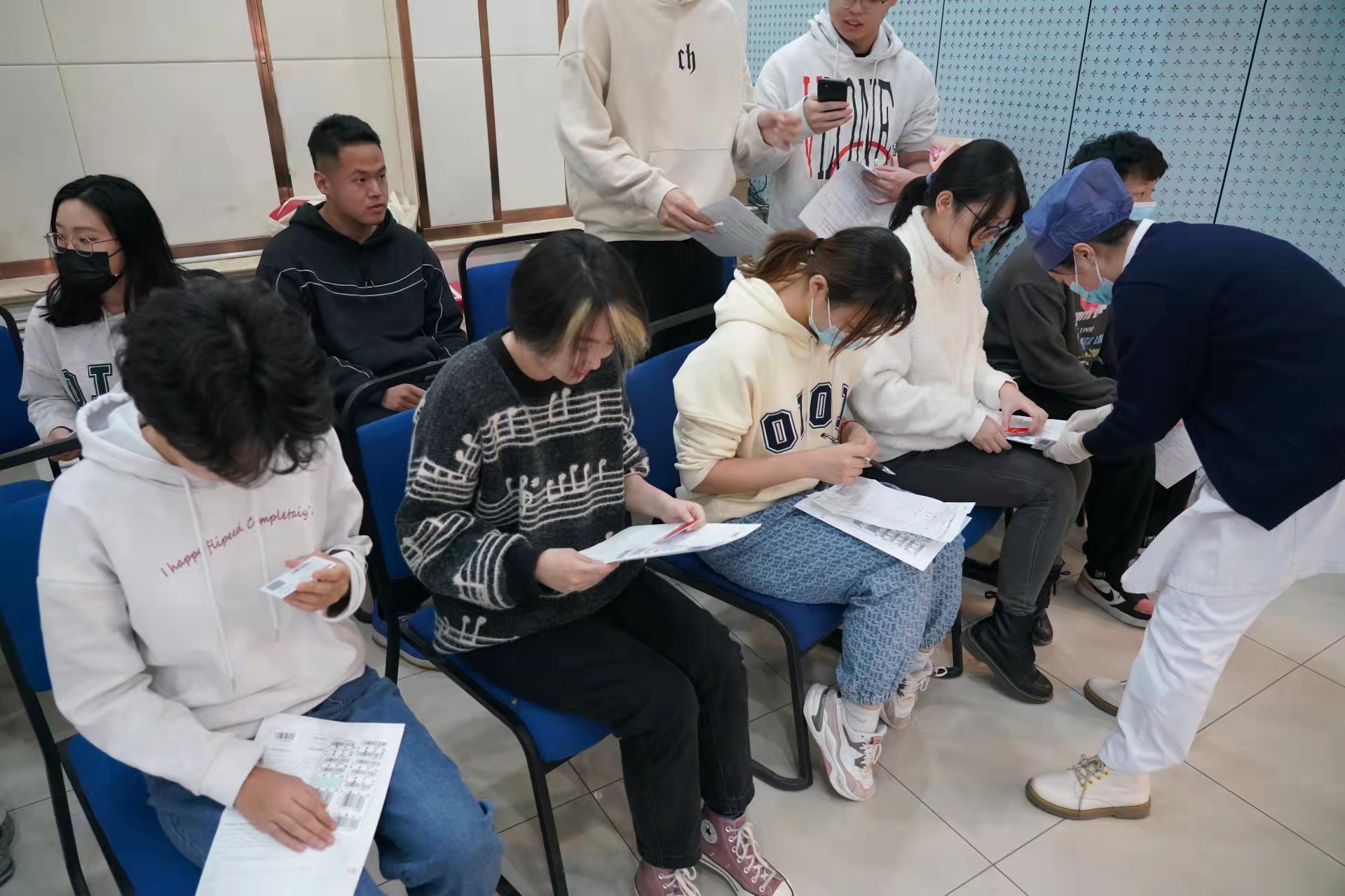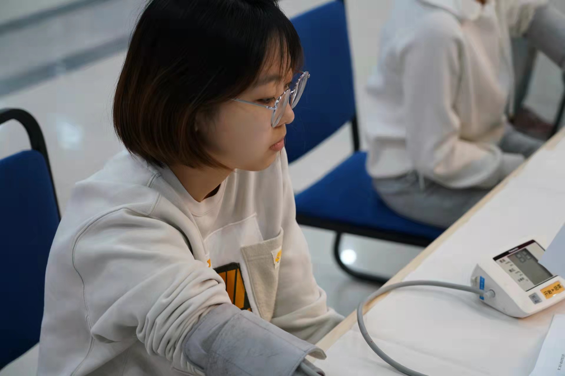 同学们满怀热情地做着准备,按照流程填表登记,测量血压,检测血液,时刻关注着自己的检测结果,希望能够顺利献血。
