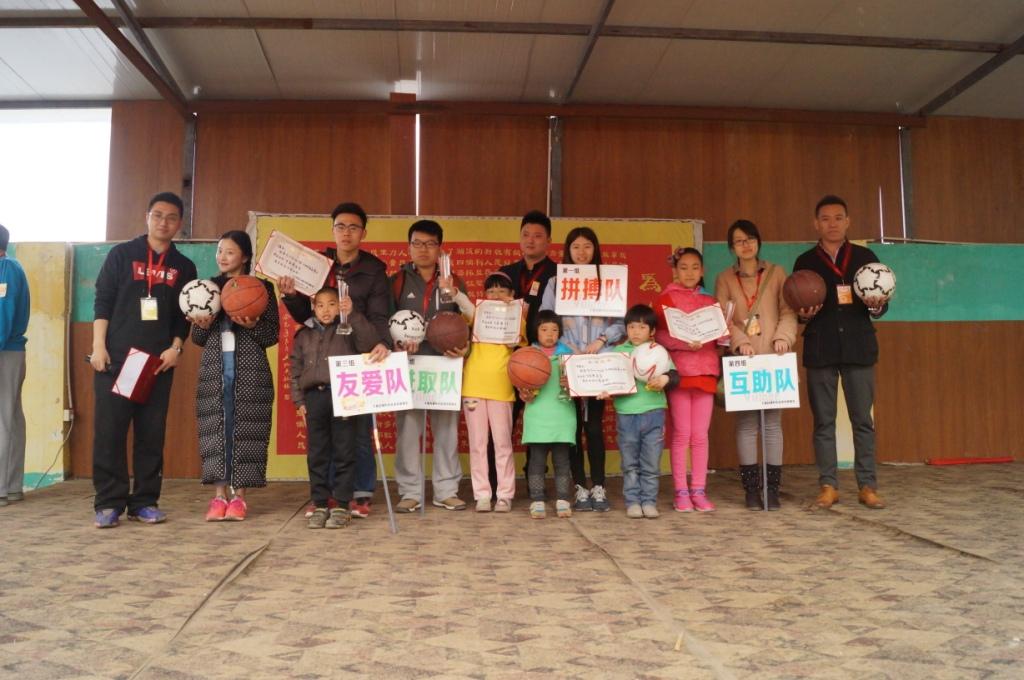 尽管刚下过雨,空气中仍然弥漫着丝丝寒意,可是我们的志愿者内心都充满了暖意,期待着将自己的爱心与温暖传递给太阳村的小朋友们。志愿者分队到达太阳村农场后,立即投入到赛前的准备工作中,随后经过赛会组织者安排,志愿者分队承担了运动会的领队和裁判工作,同时协助维持运动会秩序。太阳村的小小运动健儿们组成了“拼搏队”、“进取队”、“互助队”、“友爱队”四只参赛队伍,他们将在赛场上就三个比赛项目一决高下。上午十点钟,“首届太阳村爱心杯运动会”在嘹亮的国歌声中正式开幕。首先进行的是踢毽子比赛,每支参赛队伍选出四位选手组成两组,运动员之间交替踢毽子两分钟,计数多者胜出。一轮赛罢,“进取队”的两组四位小朋友以总计96次的好成绩暂时领先。接下来进行的是跳绳比赛,同样是每队选出四名队员组成两组进行比赛,两位队员同时完成一次跳绳算合格,计数多者胜出,这轮比赛,“友爱队”不甘落后,他们选出四位出色的小伙子,配合默契,最终以两分钟跳绳382次的成绩遥遥领先其他组。最后进行的拔河比赛移至室外操场,四支参赛队伍分成两组,经过两轮激烈的比拼,“拼搏队”最终战胜“互助队”,夺得拔河比赛的第一名。