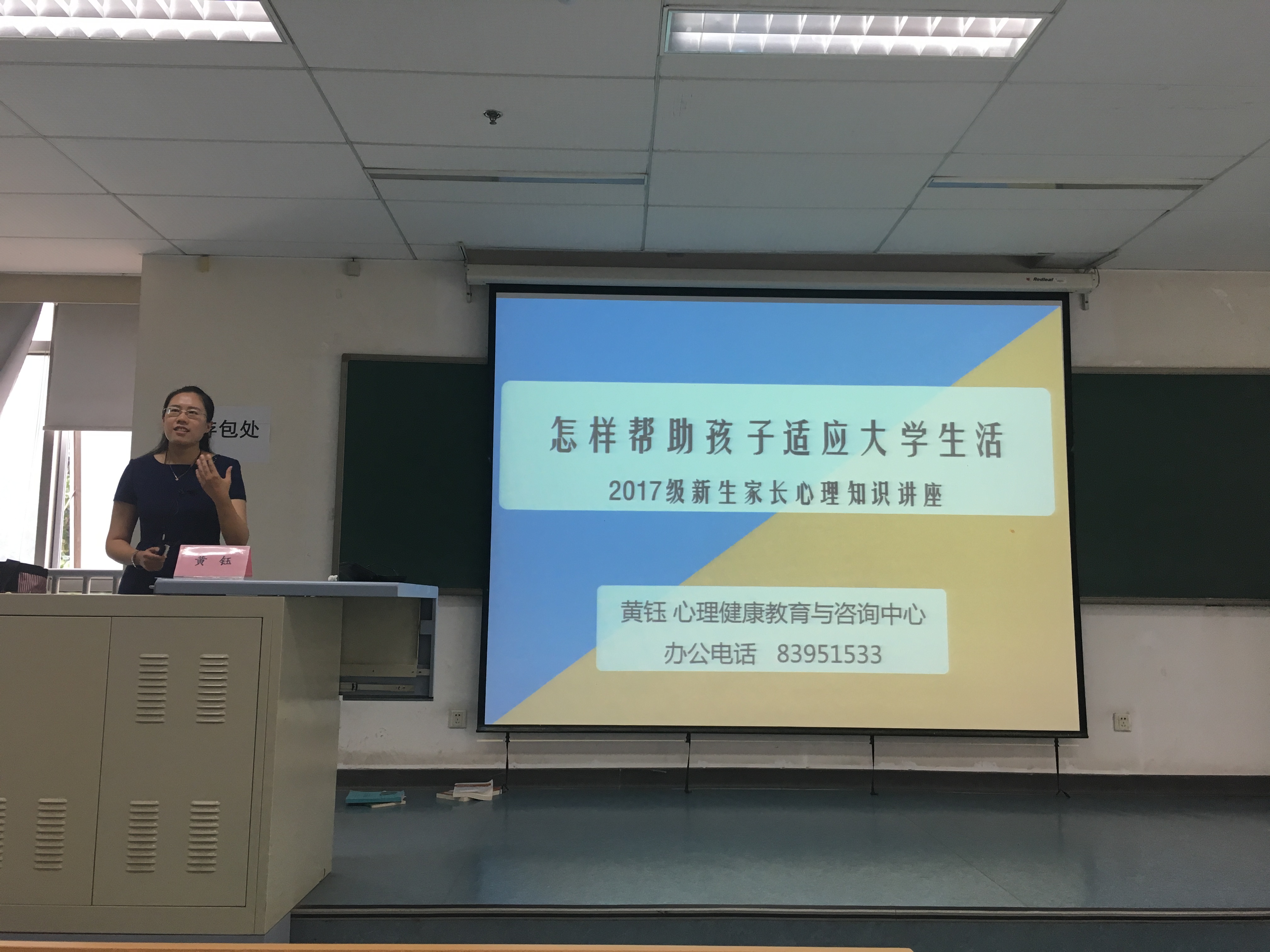 新生家长学校在博学楼第四阶梯教室举办,学生处心理咨询中心教师黄钰,为新生家长带来题为“怎样帮孩子适应大学生活”的主题讲座,以期与新生家长一道,为孩子今后的健康成长保驾护航。