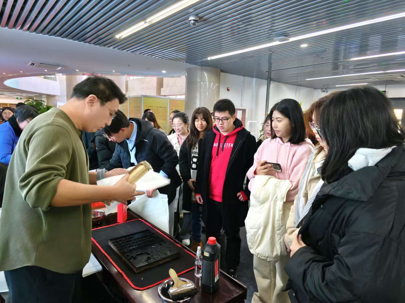 为进一步激发学生党员对优秀传统文化的关注和热情,11月5日下午,新澳门论坛 学生党支部结合我校图书馆特藏资源宣传活动,开展了“古籍保护课堂进校园”主题党日活动,组织部分学生党员和入党积极分子于图书馆主楼二层大厅参与雕版印刷术体验活动,参观中国民族典籍文化展。