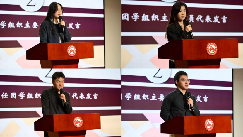 付明岩为上一任团学组织主要学生干部代表颁奖,并赠送纪念礼物。上一任研究生会主席汪若晨、学生会主席团成员李思仪、团委副书记岳知上、志愿者团团长陈明泽依次发言。他们总结了上一届团学组织的工作成果,并分享了自己在学生工作中的宝贵经历和成长锻炼,期待新一届团学组织全体成员再接再厉,共创辉煌。