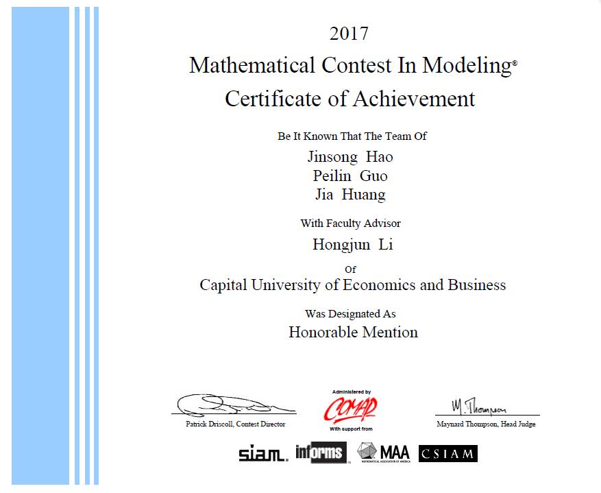 参赛同学在此次竞赛中取得了优异的成绩。1个小组获得了Meritorious Winner奖项,2个小组获得了Honorable Mention奖项,2个小组获得了Successful Participant奖项。