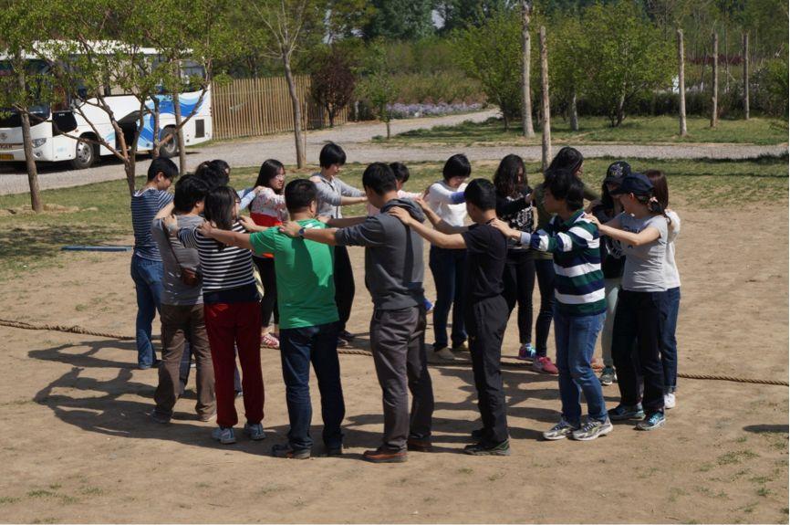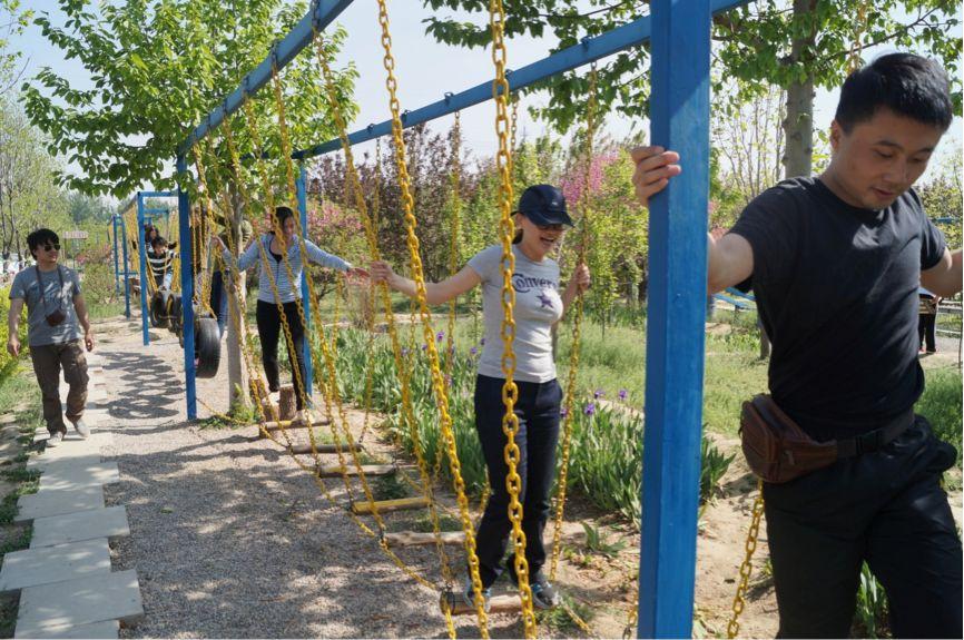 吃完烧烤,大家四处溜达拍拍照,稍作休息后便开始团队拓展活动。第一个活动叫激情节拍。教练先让我们分成两队,每队围成一个圆圈,面向中心站立,然后拍队友的肩膀,先左后右,左一下,喊“一”,右一下喊“一”,然后拍手喊“我”;左两下喊“一二”,右两下喊“一二”,再拍手喊“我们”……依此类推,一直喊道“我们是最棒的团队”。其中一队非常的有经验,练习的时候表现出非一般的速度,另外一队甘拜下风,调侃的把游戏的口号换成“你们赢了”,大家笑成一团。第二个活动叫布袋跳跳,即两组的老师分别用袋子将双脚套住,然后前往指定的障碍物再折返的接力比赛,比哪组能更快的返回终点。在比赛的过程中,每个参赛老师都拼尽全力往前蹦,其他老师在旁边助威,还不断的提醒要注意安全。秉承着友谊第一,比赛第二的精神,速度较快的一队老师甚至停下来等另一队的老师继续比赛。第三个项目是拔河比赛,大家为了取得胜利竭尽全力,通过换人和换场地,进行了三场拔河比赛,一些老师的手都被绳子磨了皮。最后,一些老师还进行项目闯关,凭借体力和毅力穿过各种摇晃的障碍物抵达终点。完成拓展训练的老师意犹未尽,还一起玩起了跷跷板和荡秋千,大家开心玩乐,仿佛回到童年时光。