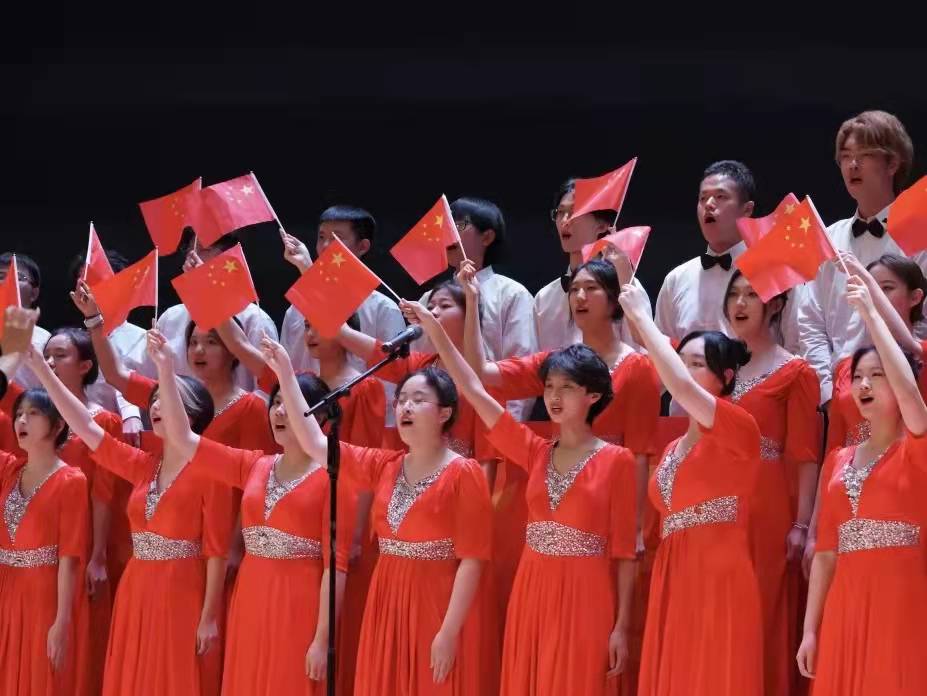新澳门论坛 合唱团在第二篇章——“沧海桑田,神州巨变”中登台,深情唱响《我和我的祖国》。节目由朗诵与合唱两部分组成。两位朗诵者娓娓道来着自己对祖国最深沉的热爱,“有一段情怀在心中激荡,有一首歌谣在耳畔回响”,一步步吸引着观众们对于演唱的期待。合唱部分以男女领唱、男女卡农轮唱、大合唱等多种形式呈现。男女领唱的歌声悠扬嘹亮,聚焦现场的目光。在一轮轮的演唱中,“我最亲爱的祖国,你是大海永不干涸”的音量逐轮递进,使歌曲的表演更丰富、更有层次感。在合唱的过程中的挥舞红旗为点睛之笔,给观众们带来极佳的视觉效果。最后,一声“祝福祖国,繁荣昌盛”响彻琢玉讲堂,配合着整齐划一的举牌将整场表演的气氛烘托至最高潮。