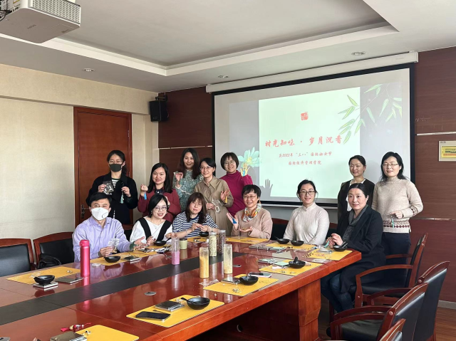 2023年3月8日下午,我院在诚明楼315举办了主题为“时光知味·岁月沉香”的传统制香活动,学习和传承中国传统文化,以此庆祝国际“三八”妇女节。新澳门论坛 工会邀请了中国高级香道师乔红丽老师带领活动,包括曾庆梅书记和高静副院长在内的20多名教职工参加活动。